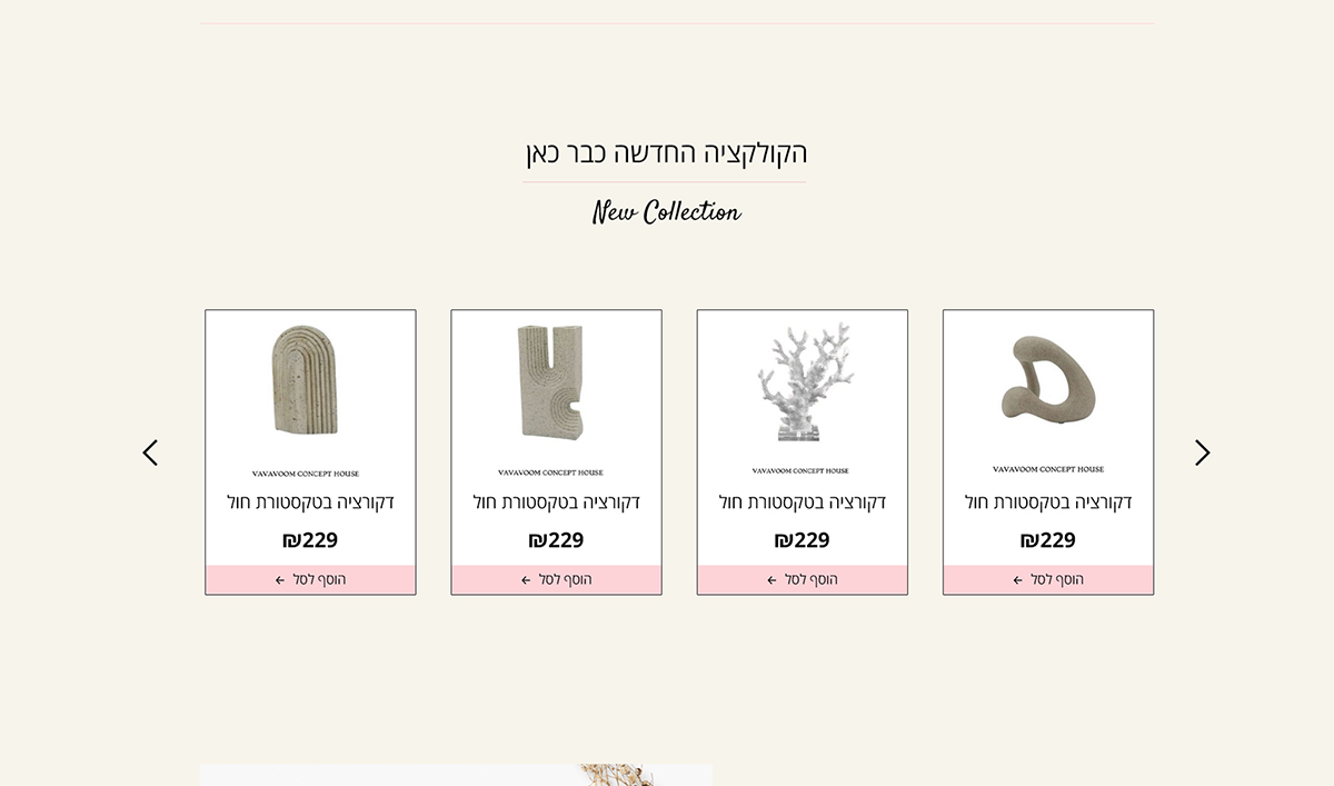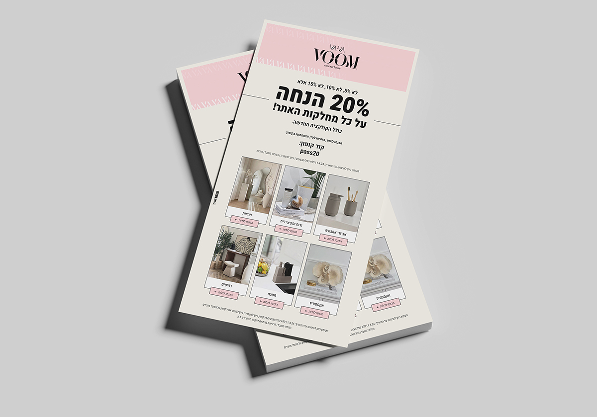 עיצבנו עבור חברת VAVAVOOM חוויית משתמש עדכנית ומרעננת עם דגש על עיצוב נקי ומודרני. ביצענו שדרוג מקיף לדף הבית של האתר, שם התמקדנו ביצירת עיצוב שמבליט את המותג ומעורר עניין כבר מהשנייה הראשונה. בנוסף, עיצבנו ניוזלטר שמכוון להגדיל את המעורבות של הלקוחות עם קריאות לפעולה ברורות ועיצוב שמתחבר לשפת המותג. לבסוף, יצרנו באנר לאתר שתומך בקמפיינים פרסומיים ומעביר את המסר בצורה בולטת וויזואלית, תוך שמירה על אחידות בעיצוב הכללי של המותג.